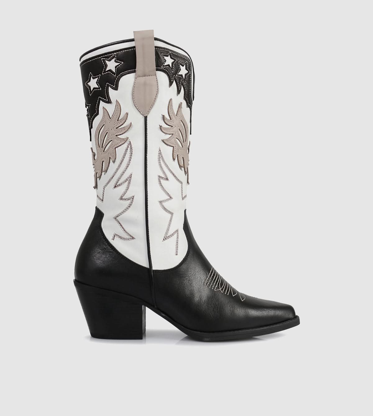 The Zoey Mid Boots by S Sempre Di bring a bold Western-inspired aesthetic to modern footwear. Crafted from premium leather, these mid-calf boots feature striking two-tone detailing with intricate embroidery for a statement look. A pointed toe and sturdy block heel add a refined touch, while the pull tabs ensure easy wear. Designed for both style and comfort, these boots make a versatile addition to any wardrobe.