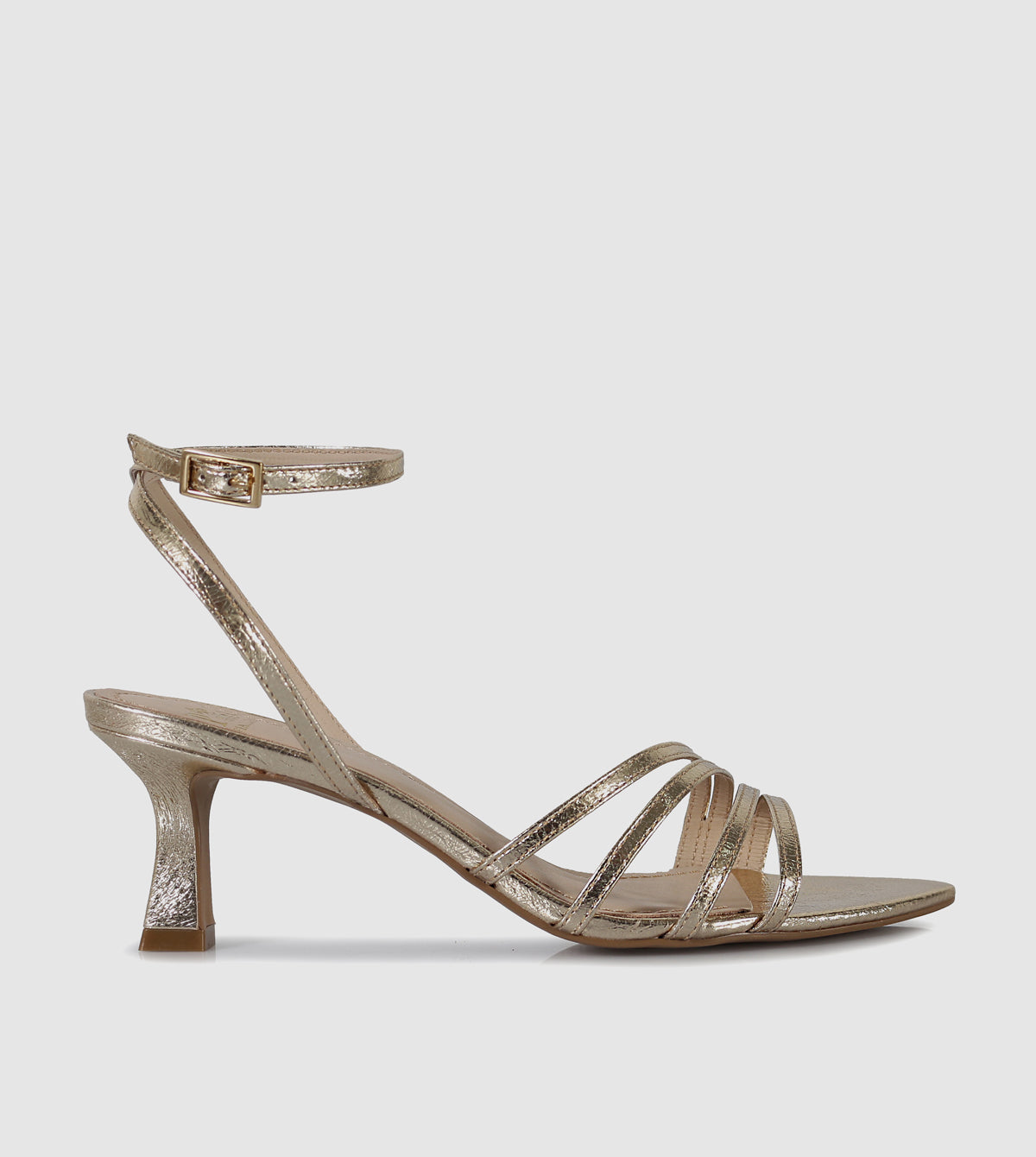 The Luma Heels by Pg Piazza Grande bring refined glamour to evening and occasion wear. Crafted in metallic leather, this sandal features delicate crossover straps that flatter the foot with a barely-there finish. A slim ankle strap ensures a secure fit, while the mid-height flared heel offers both stability and style. Lightweight and versatile, Luma is the perfect heel for weddings, parties, and elegant nights out.