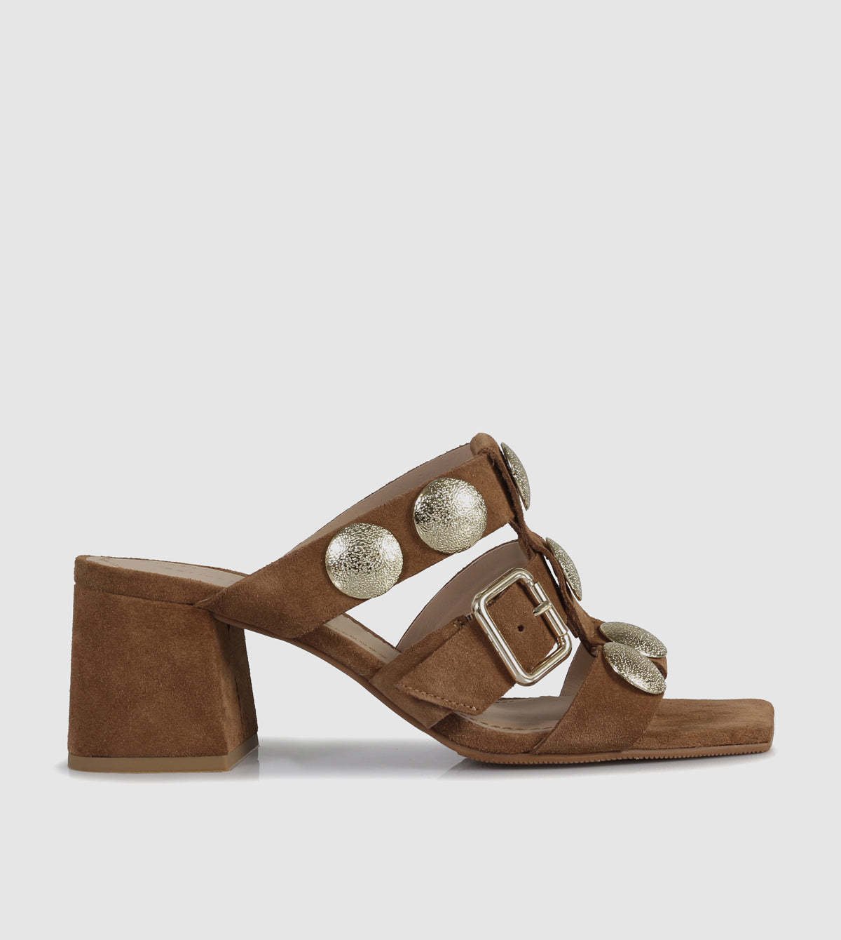 The Fiora Block Sandals by Sempre Di make a bold statement with artisanal detail and modern structure. Crafted from soft suede, this slip-on style is defined by wide straps embellished with oversized metallic studs, creating a striking contrast of texture and shine. Balanced on a sturdy block heel with a cushioned footbed, Fiora offers comfort without sacrificing impact. A contemporary choice for elevating both day and evening looks.