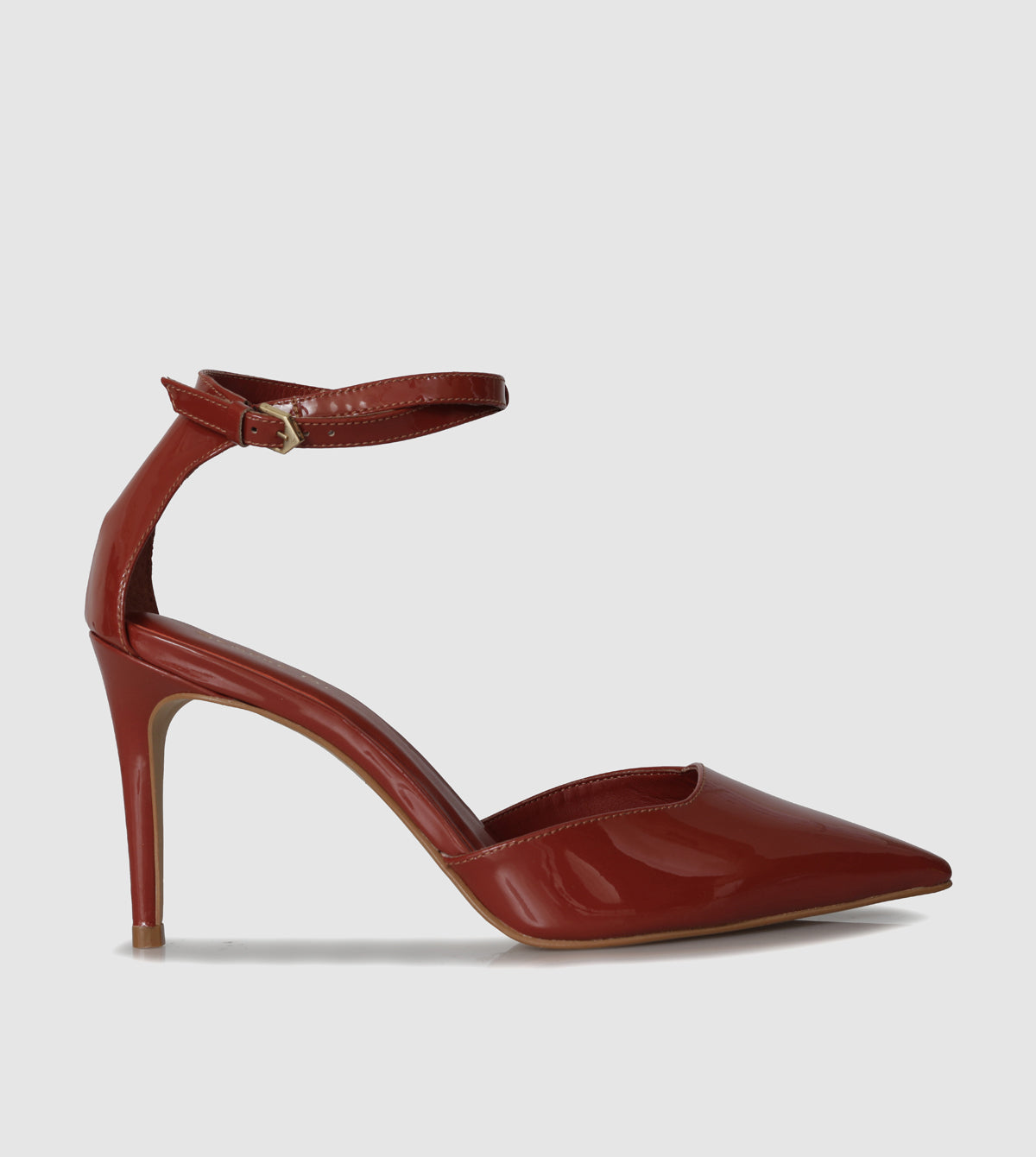 Add sophistication to your outfit with Clarinda Heeled Pumps by Sempre Di. Crafted in Black or Burgundy patent, these heels have a bold and chic look with a 9 cm stiletto, a closed back ankle strap, and an open wasted vamp. Elevate your style and confidence with these stunning pumps.