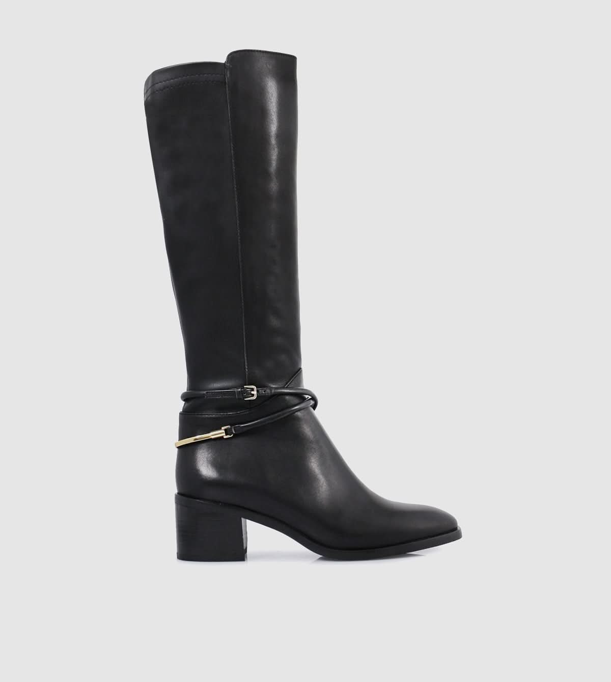 The Paige Knee-high Boots by S Sempre Di blend timeless elegance with subtle equestrian flair. Crafted from smooth premium leather, these boots feature a softly rounded toe and a mid-height block heel for balance and sophistication. A slim strap with metallic hardware wraps around the ankle for a refined accent, while the full side zip ensures easy wear.
