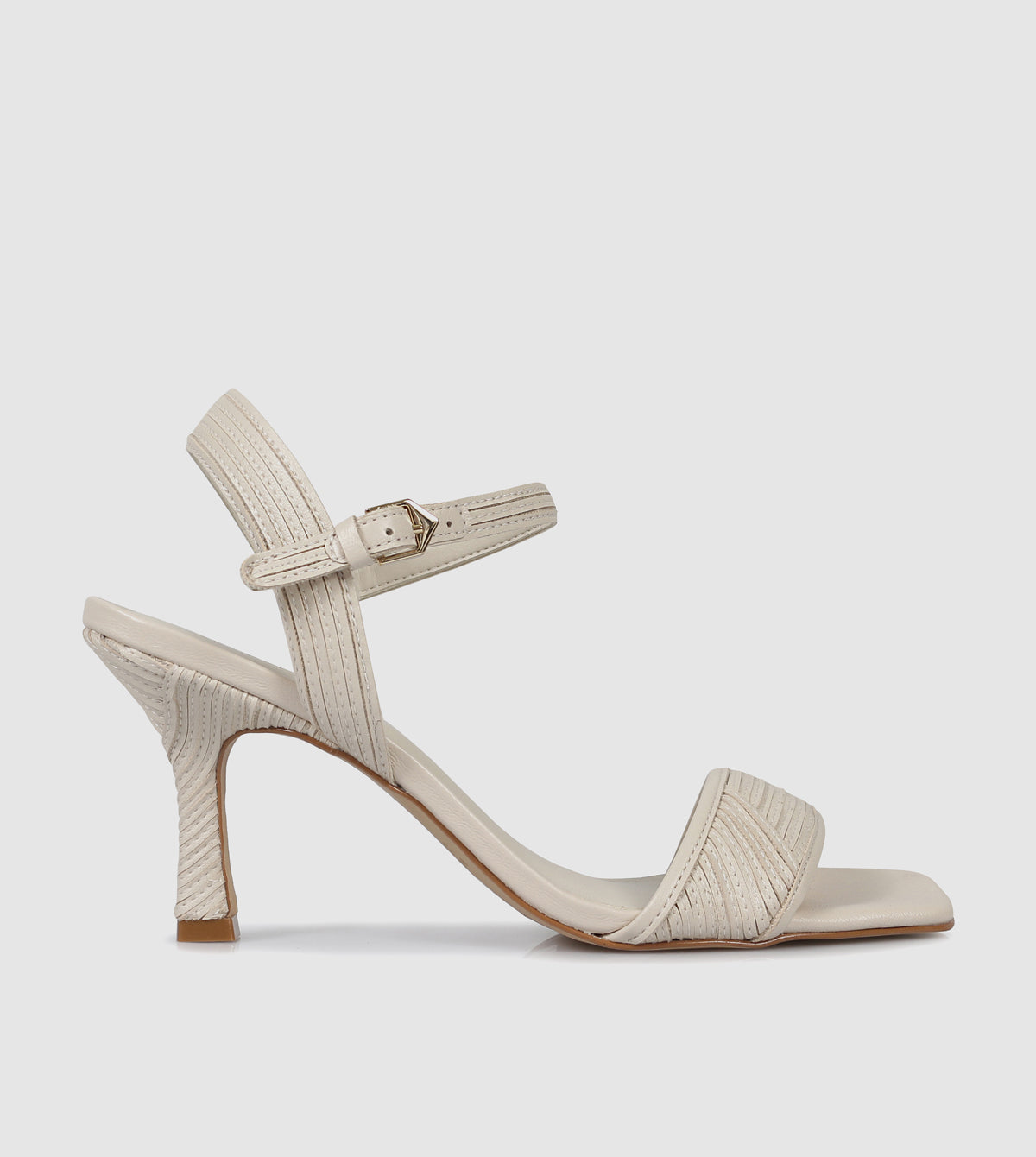 The Isola Heeled Sandals by Sempre Di bring understated sophistication to occasion dressing. Crafted in leather with subtle textured detailing, this style features a slim strap across the toe and a secure ankle buckle. The mid stiletto heel is wrapped for a polished finish, while the square toe adds a modern edge. Also available in black, Isola pairs effortlessly with everything from tailored looks to evening wear.