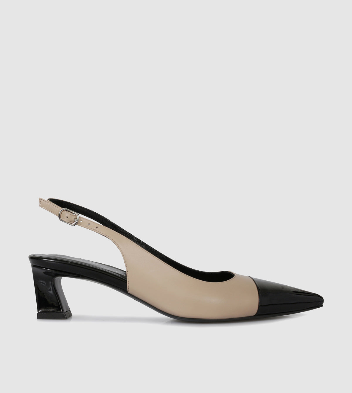 Introducing Neva Kitten Sling backs from Sempre Di. A cool and contemporary addition to your shoe collection. These kitten heels feature a modern elongated pointed toe and are crafted in a two tone patent leather finish. Elevate your style with these sleek and sophisticated sling backs.