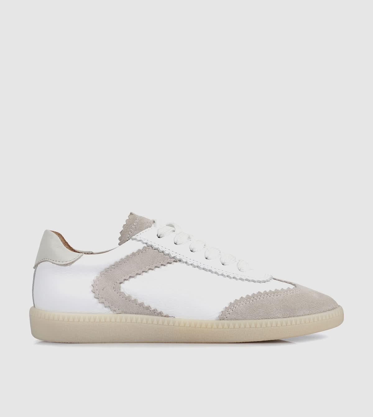 The Farrah Low Top Sneakers by Sempre Di bring a clean, modern look to your casual wardrobe. Crafted from a combination of smooth leather and soft suede, these sneakers feature a classic round toe, minimalist panelling, and a neutral colour palette for effortless styling. The cushioned insole and rubber sole ensure comfort and stability throughout the day.