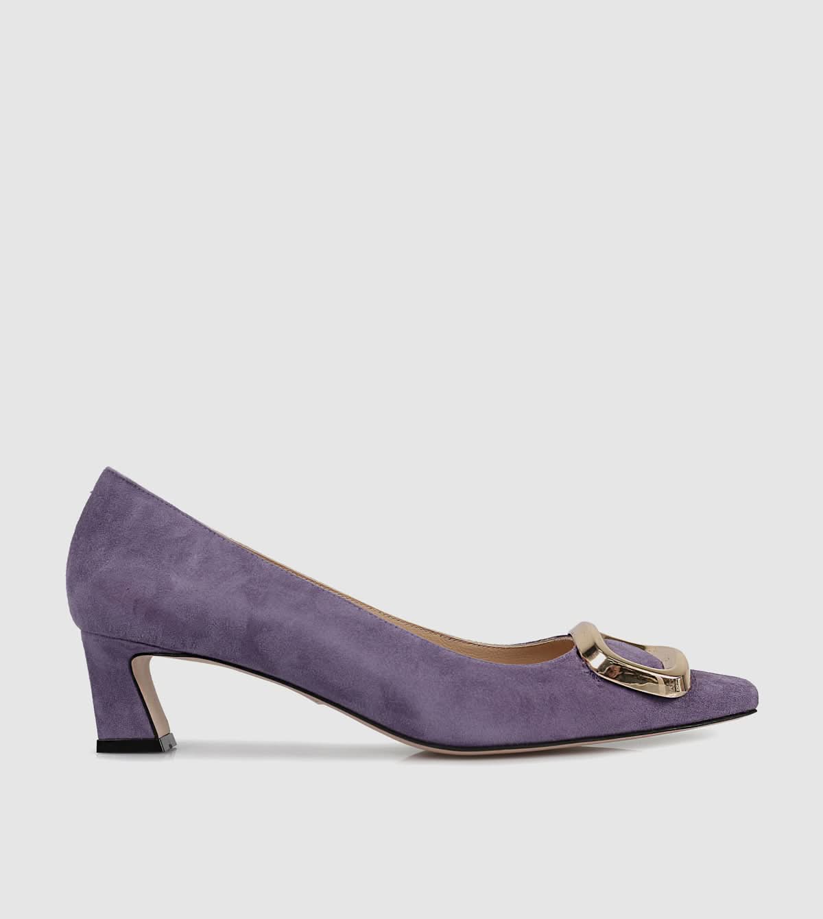 The Kiara Courtshoes by Sempre Di blend feminine charm with refined elegance. Featuring a soft suede finish and a metallic buckle detail on the toe, these mid-heeled court shoes are ideal for both office days and special occasions.