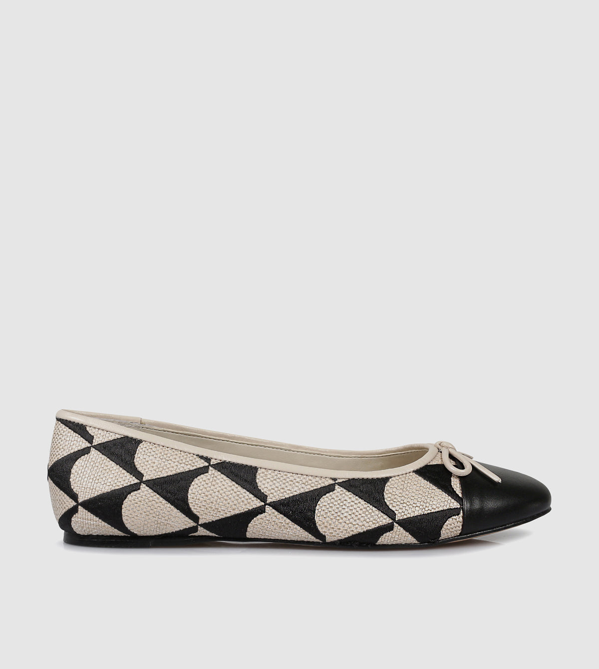The Jodi Ballerinas by Sempre Di bring a playful update to the classic ballet flat. Featuring a black and cream geometric textile design with a smooth leather toe cap, this style balances everyday comfort with distinctive detail. A dainty bow at the front adds a feminine touch, while the slim sole keeps the profile sleek and versatile for work, travel, or weekend wear. Available in black, or cream.