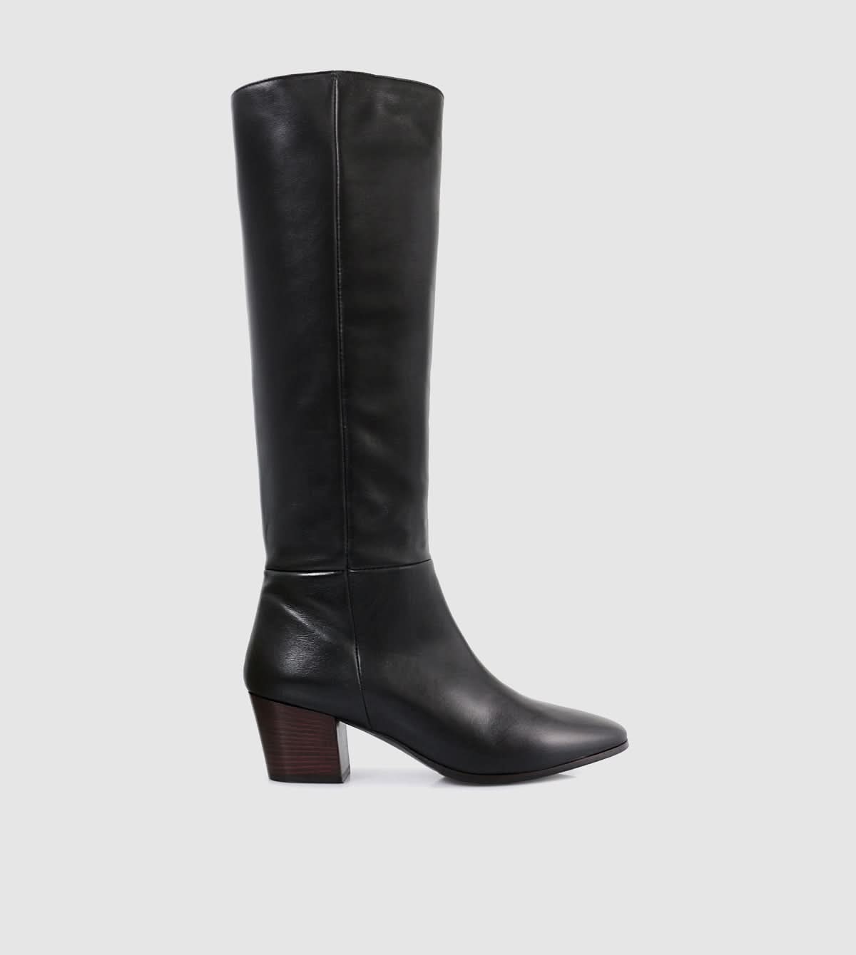 The Sybil Knee-high Boots by Sempre Di exude timeless sophistication with a sleek, structured silhouette. Crafted from premium leather, these boots feature a softly pointed toe and a sturdy mid-height block heel, offering both elegance and comfort. The streamlined design ensures a flattering fit, making them a versatile addition to any wardrobe.