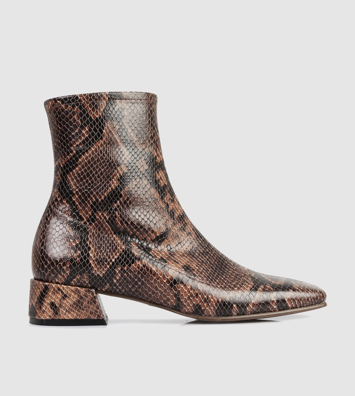 Make a statement with the new Tanana Ankle Boots by Sempre Di. Available in a snake print. These boots are designed to elevate any outfit this season, with a low same-tone heel, square toe shape, and slim-line silhouette with zip closure. The perfect blend of elegance and versatility, the Tanana Ankle Boots by Sempre Di are a must-have for any fashion-savvy individual.