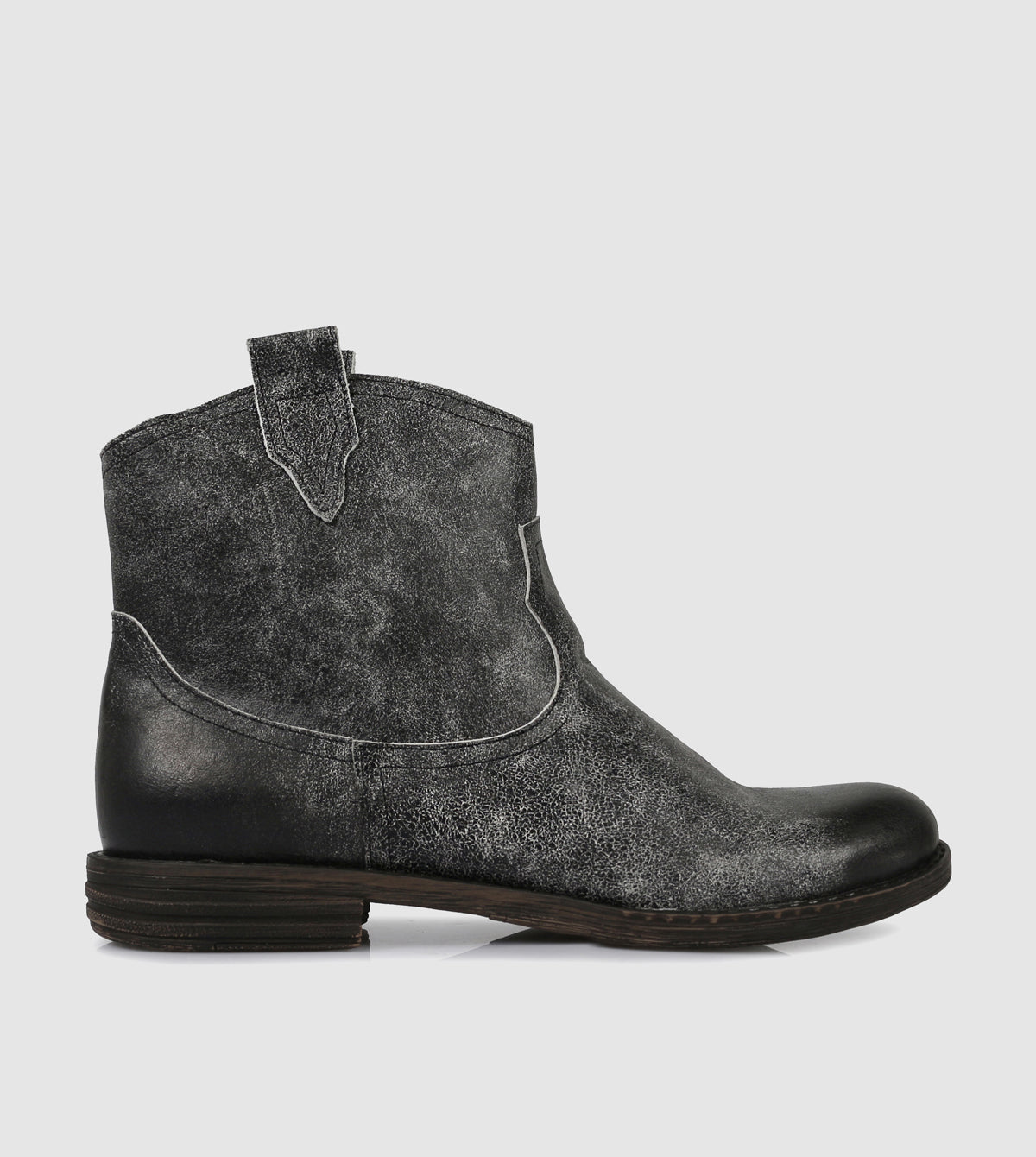 The Windy Boots by Sempre Di channel western influence with a contemporary twist. Crafted in Italy from vintage-washed leather, they feature a softly rounded toe, curved stitching detail and pull-on tabs for easy wear. The stacked low heel and distressed finish add character, making these boots a standout choice for everyday outfitting.